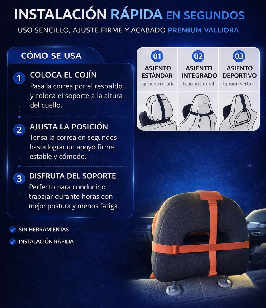 El diseño ergonómico de Valliora está pensado para acompañar la curvatura natural del cuello y la parte alta de la espalda, ayudando a mantener la cabeza en una posición más alineada durante la conducción o cuando pasas muchas horas sentado.