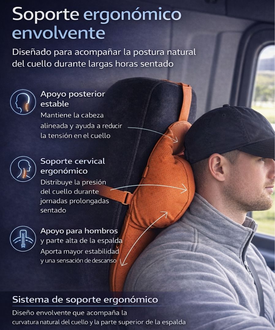 Es un apoyo diseñado para acompañar tu postura durante el trayecto y ayudarte a terminar el día con menos fatiga cervical.